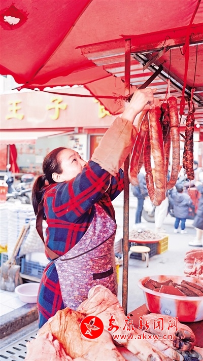 ⑩旬阳市下菜湾商贸小区内,商贩正在忙着整理腊肠。