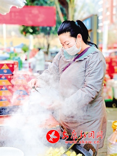 ④搬迁到白河县城关镇狮子山社区的高大姐正忙碌着自己的小吃生意。她高兴地说,春节期间人流量增加,自己的生意红火了许多。