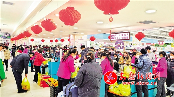 ②春节期间,平利县超市从早到晚都是人山人海,采购年货的群众把购物区围得水泄不通,肉食、蔬菜、水果、粮油等把购物车装得满满当当,一种殷实、欢乐的春节氛围在一张张笑脸中越发浓厚。