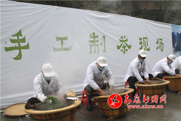 制茶人现场炒茶,介绍制茶的流程,突出岚皋茶独特制作工艺;茶艺师现场冲泡春茶,摊青、杀青、揉捻、做形、烘焙…新火试新茶,手工渐次绽现,呈现千年古法传承之景。