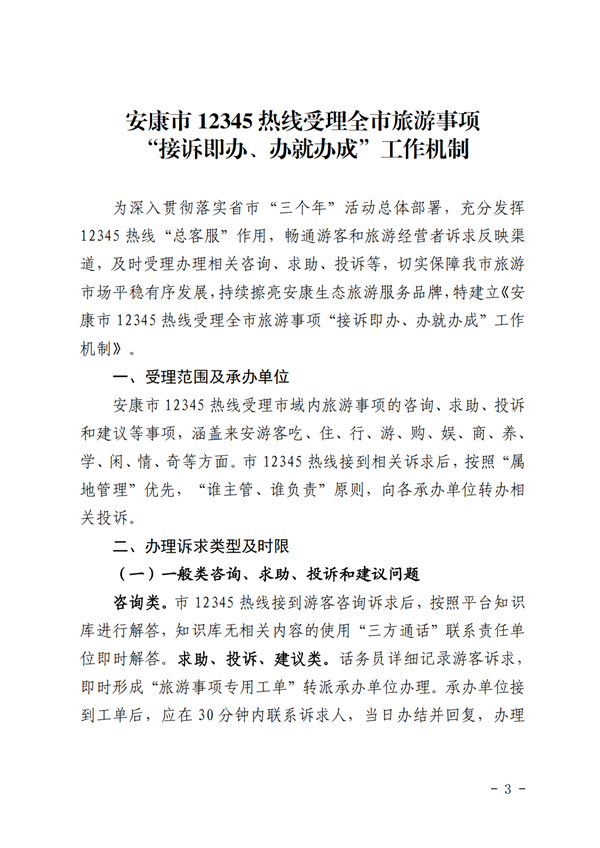为深入贯彻落实省市“三个年”活动总体部署,充分发挥12345热线“总客服”作用,畅通游客和旅游经营者诉求反映渠道,及时受理办理相关咨询、求助、投诉等,切实保障我市旅游市场平稳有序发展,持续擦亮安康生态旅游服务品牌,特建立《安康市12345热线受理全市旅游事项“接诉即办、办就办成”工作机制》。