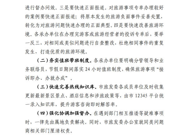 (二)夯实值班带班制度。各承办单位要明确分管领导和业务联络员,节假日期间落实24小时值班制度,确保旅游事项“接诉即办、办就办成”。
