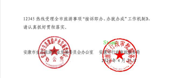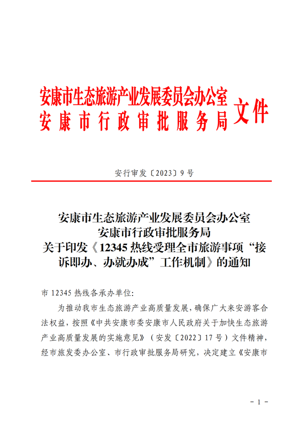 为推动我市生态旅游产业高质量发展,确保广大来安游客合法权益,按照《中共安康市委安康市人民政府关于加快生态旅游产业高质量发展的实施意见》(安发〔2022〕17号)文件精神,经市旅发委办公室、市行政审批服务局研究,决定建立《安康市12345热线受理全市旅游事项“接诉即办、办就办成”工作机制》,请认真抓好贯彻落实。