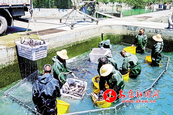 C7z安康新闻网 5月1日,岚皋县生态养殖基地的鲟龙鱼喜获丰收。 文彩琴 摄C7z安康新闻网