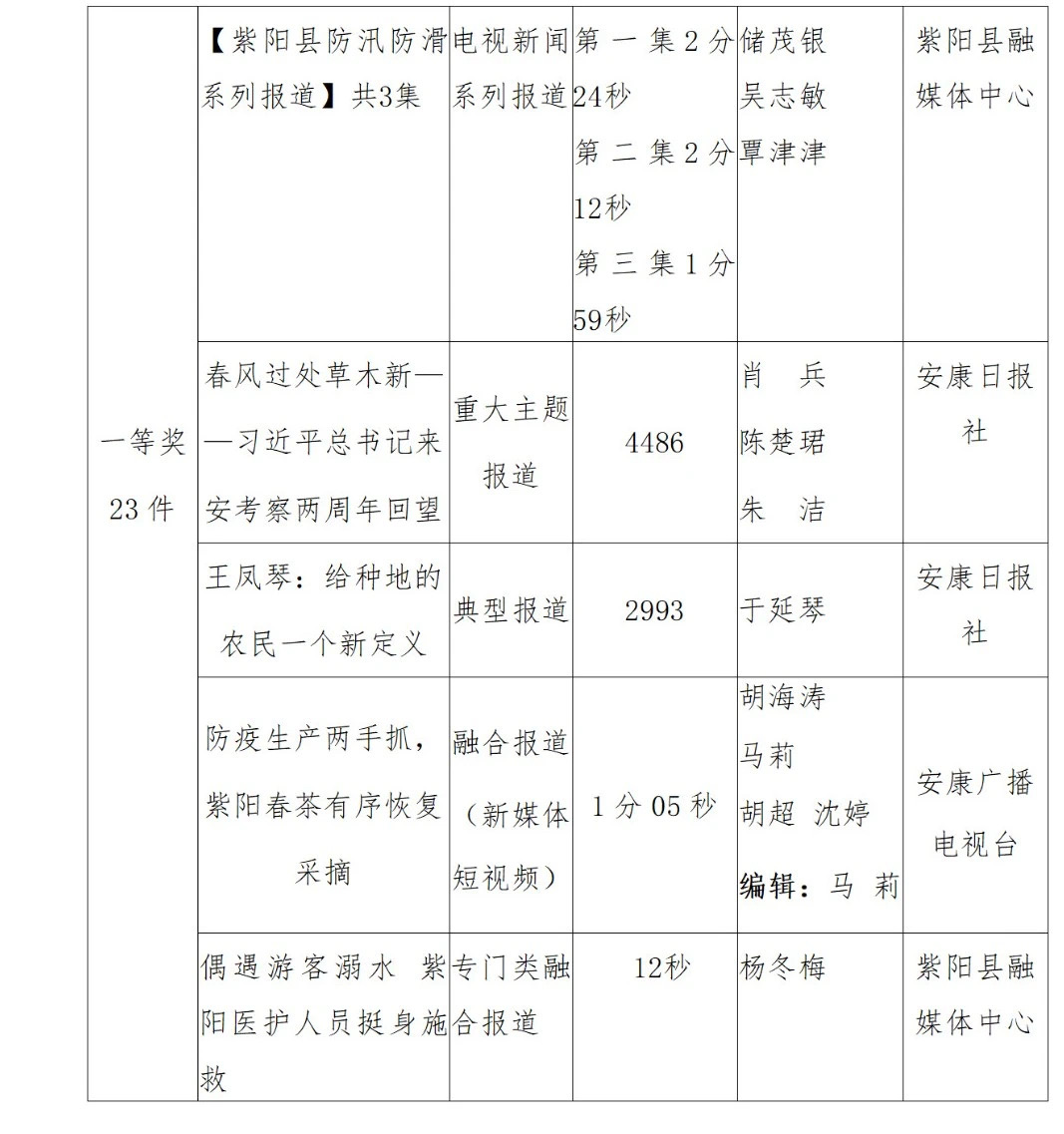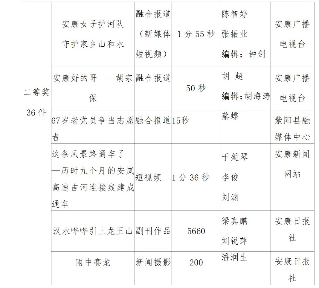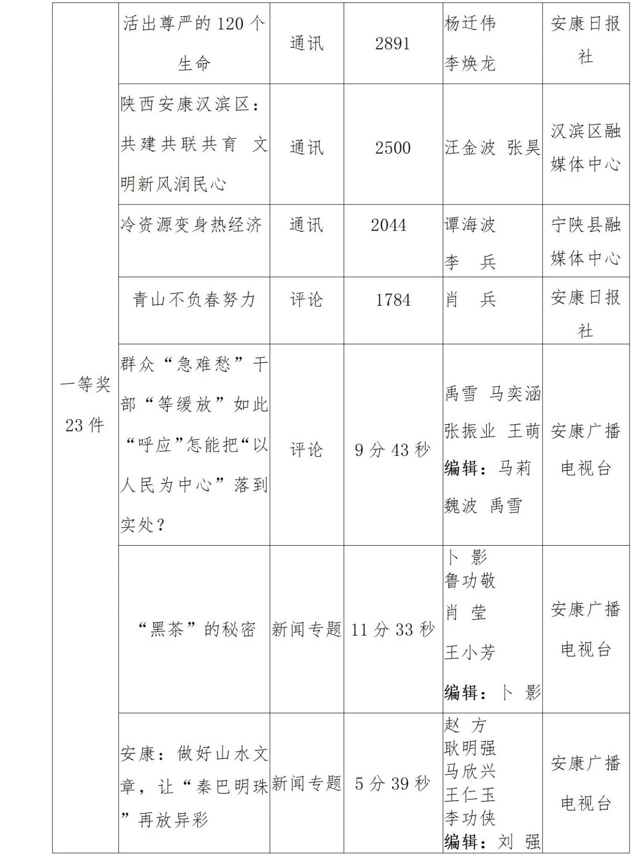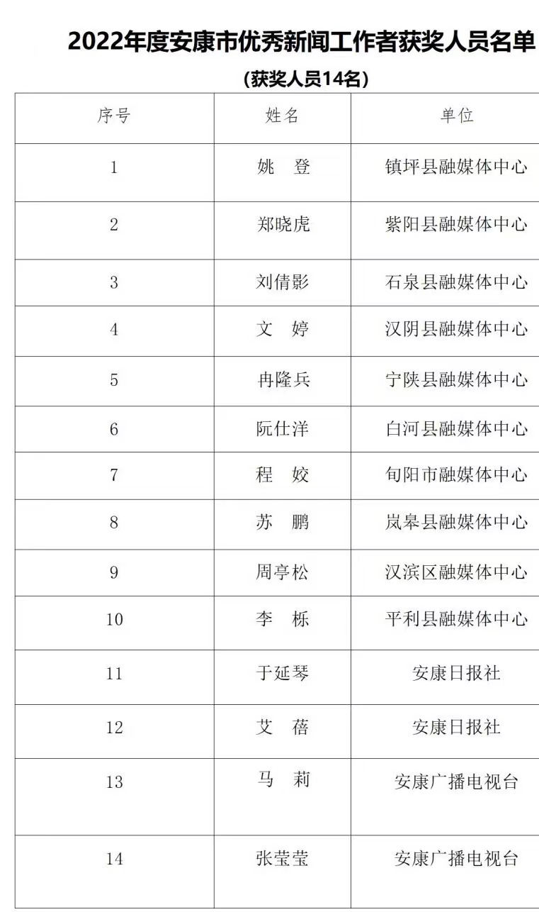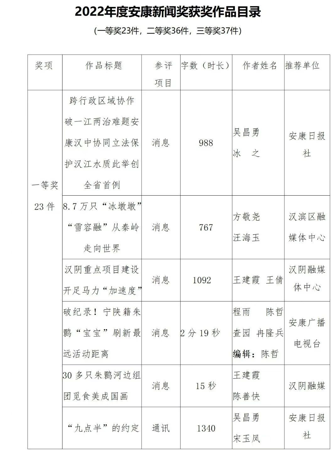 2022年度安康新闻奖评审工作在中共安康市委宣传部的指导下,由市记协具体组织实施,经过各申报单位推荐、初审,市记协复审并组织专家定评,评选出拟获安康新闻奖作品96件,其中一等奖23件、二等奖36件、三等奖37件。拟授予姚登等14名同志“安康市优秀新闻工作者”荣誉称号。5ba安康新闻网