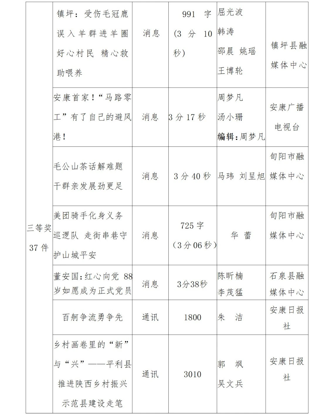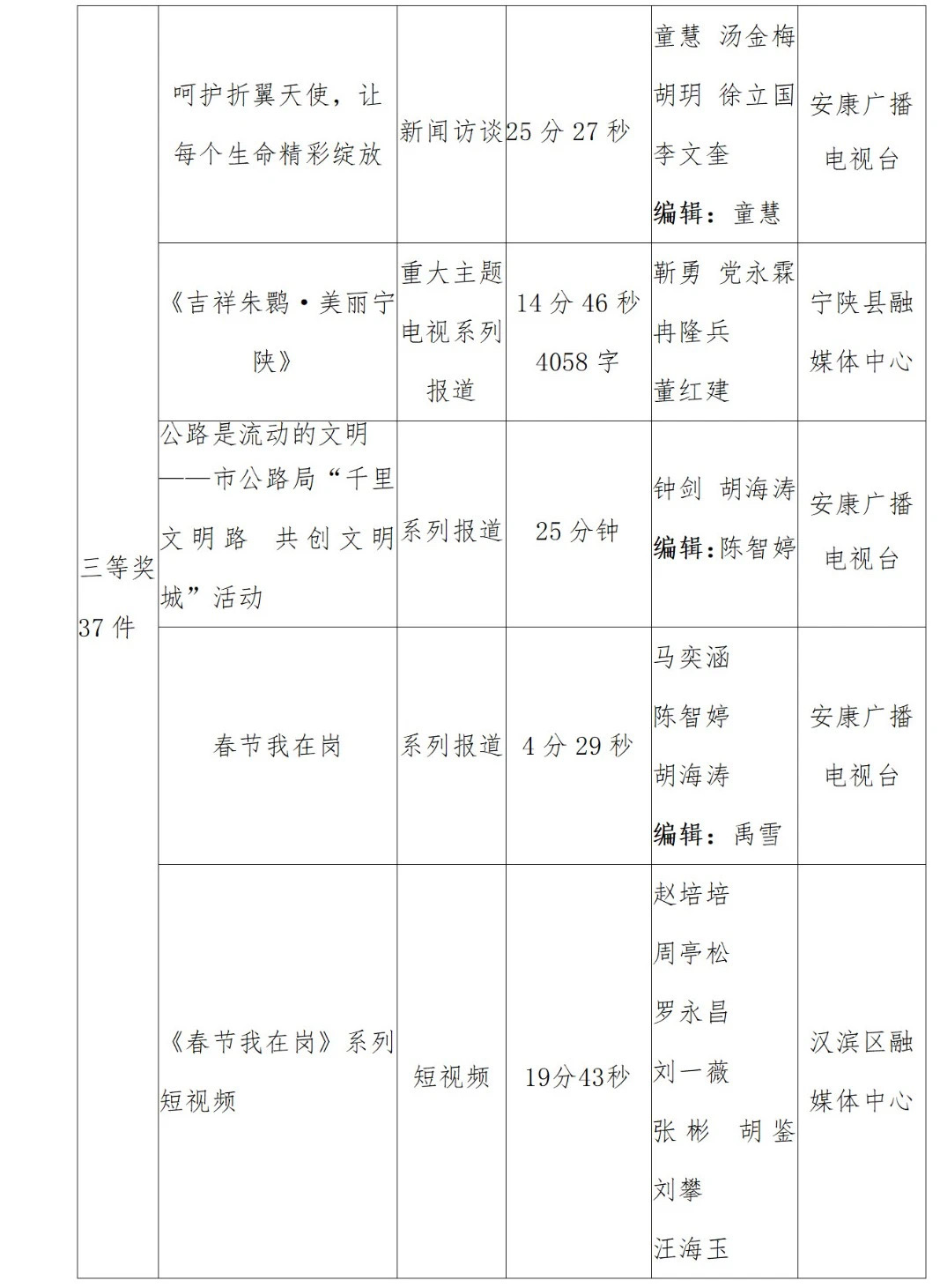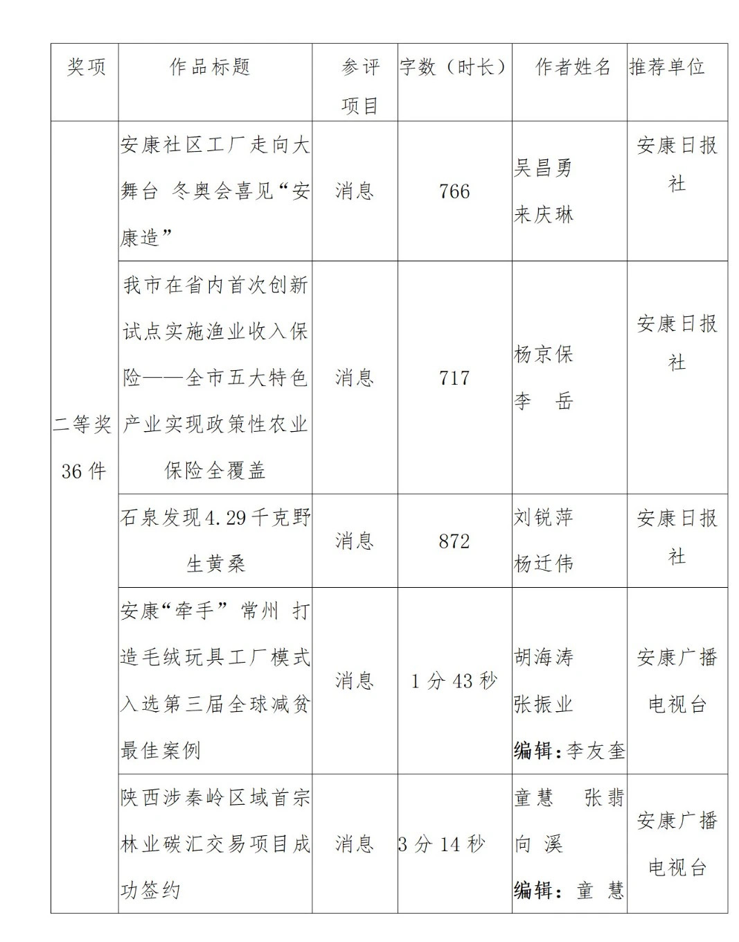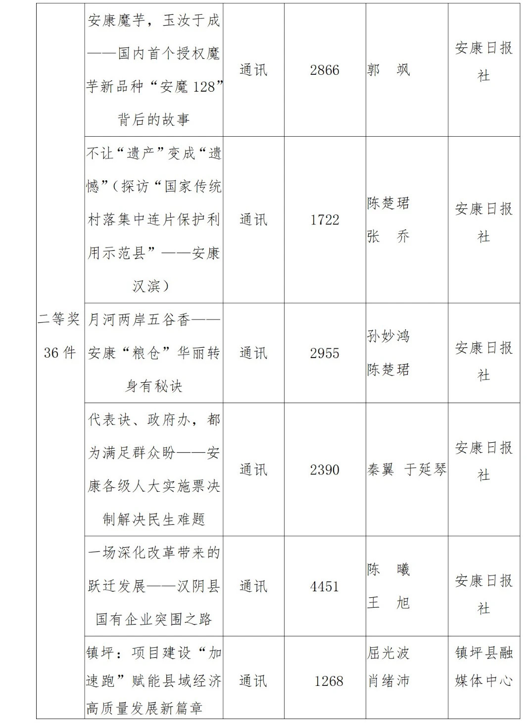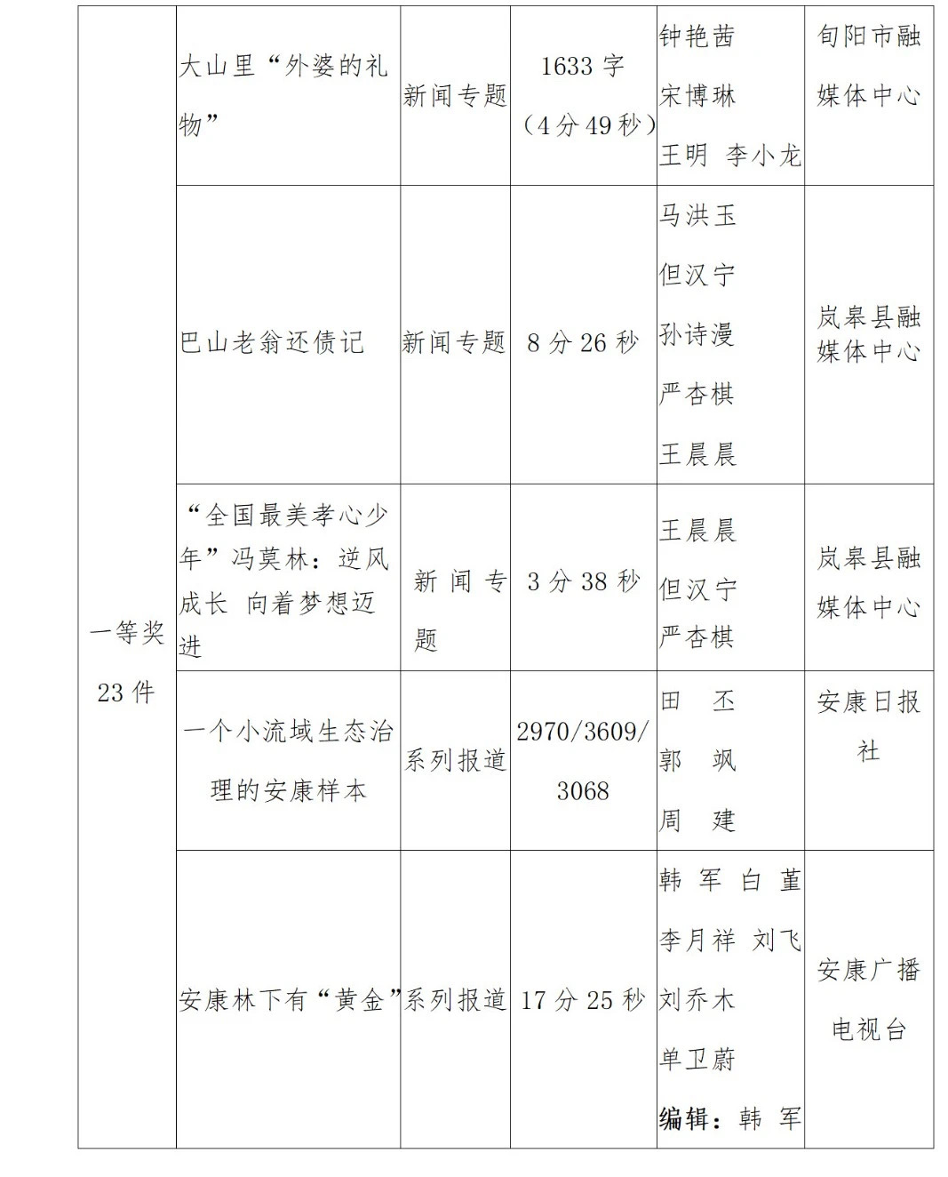 2022年度安康新闻奖评审工作在中共安康市委宣传部的指导下,由市记协具体组织实施,经过各申报单位推荐、初审,市记协复审并组织专家定评,评选出拟获安康新闻奖作品96件,其中一等奖23件、二等奖36件、三等奖37件。拟授予姚登等14名同志“安康市优秀新闻工作者”荣誉称号。5ba安康新闻网