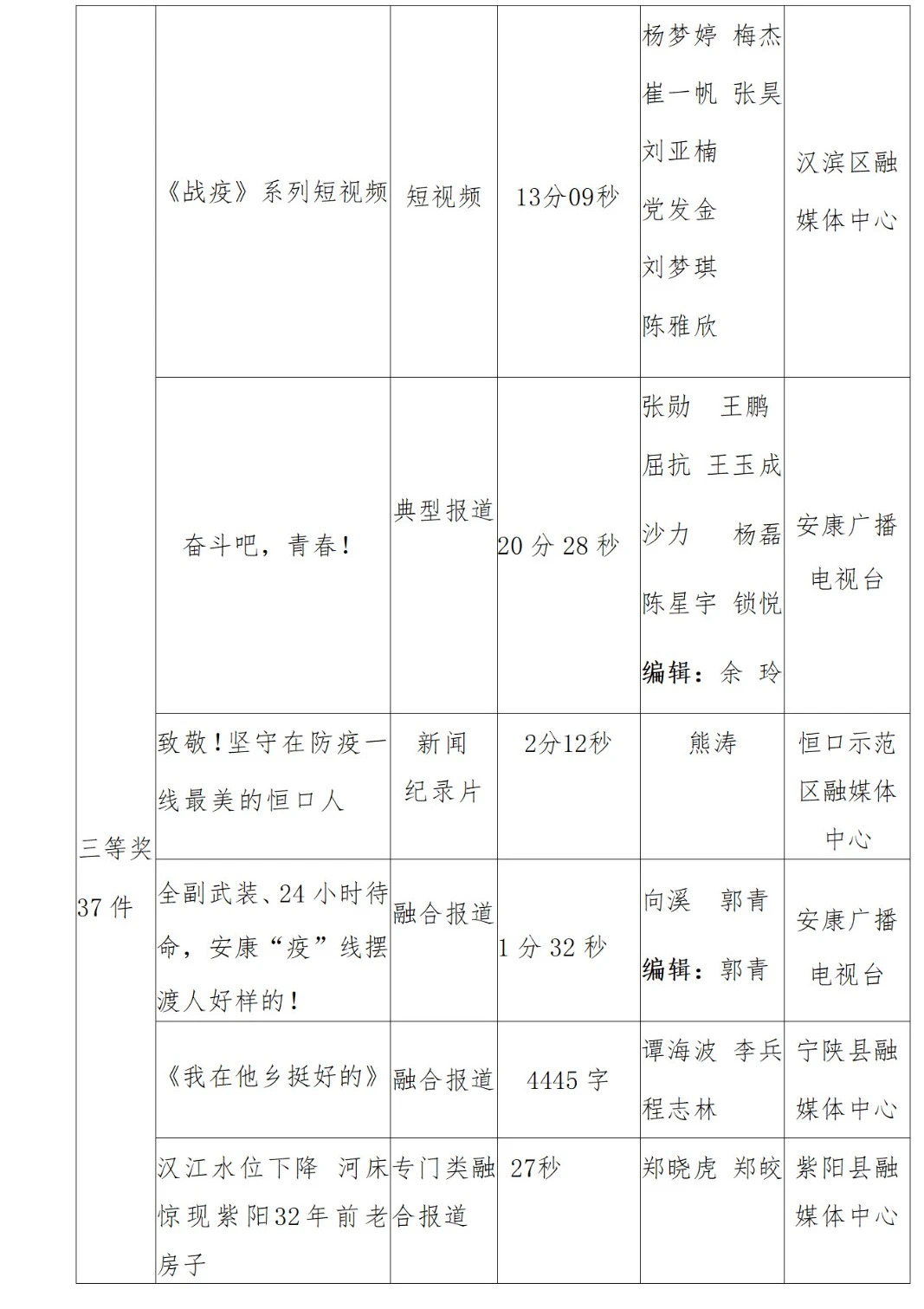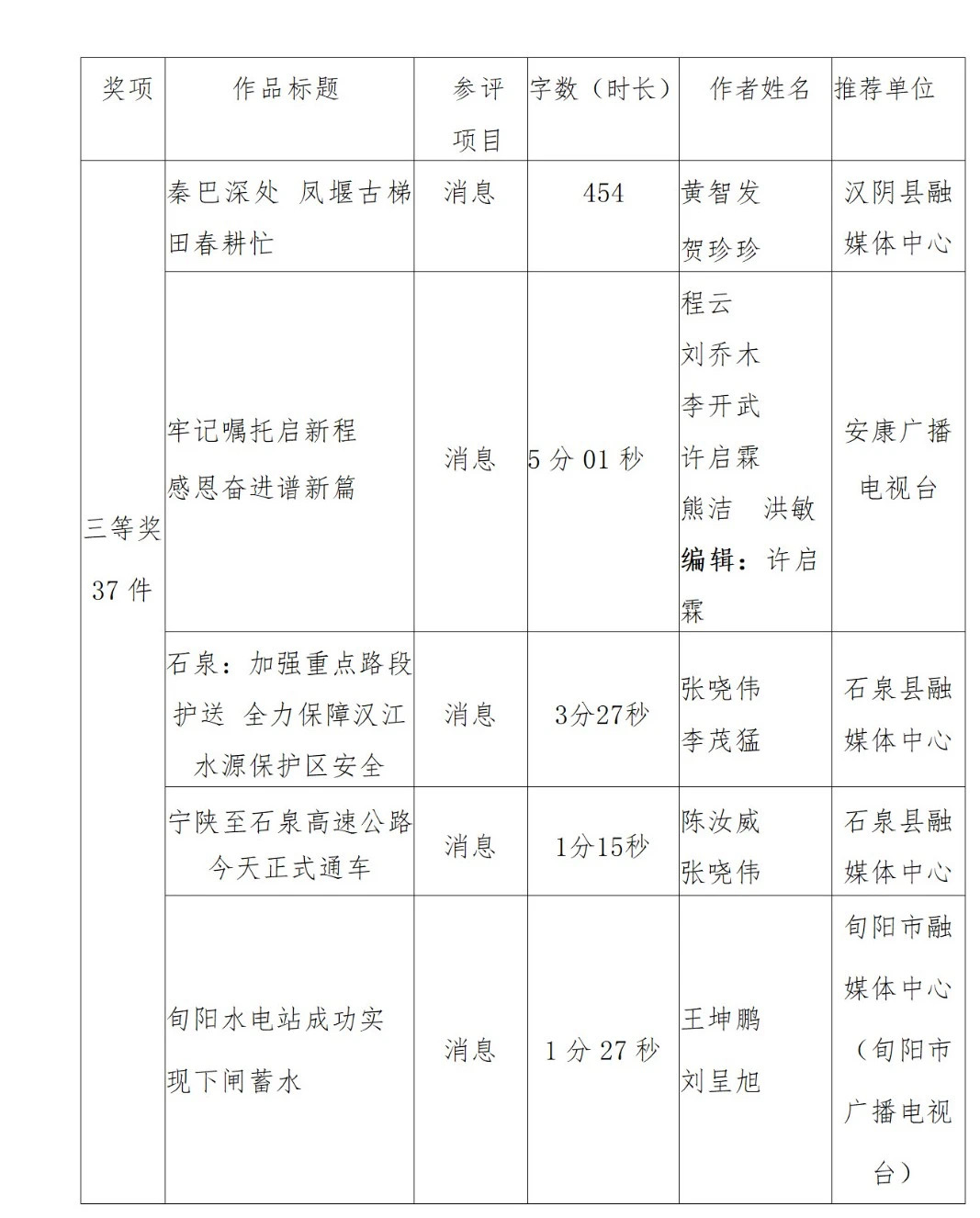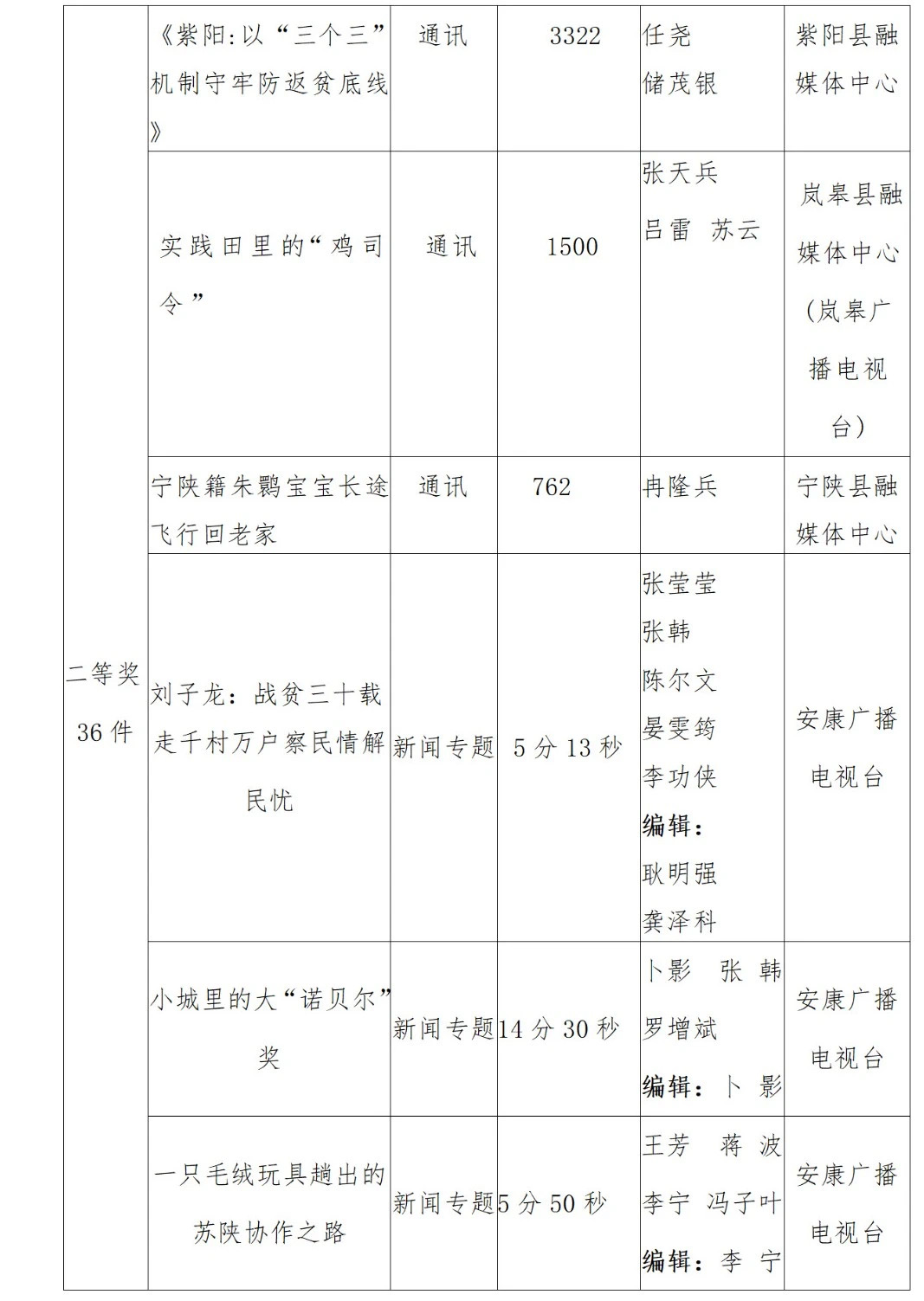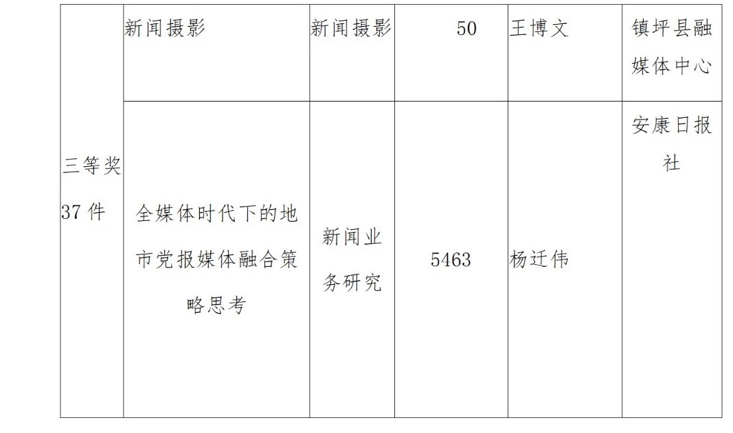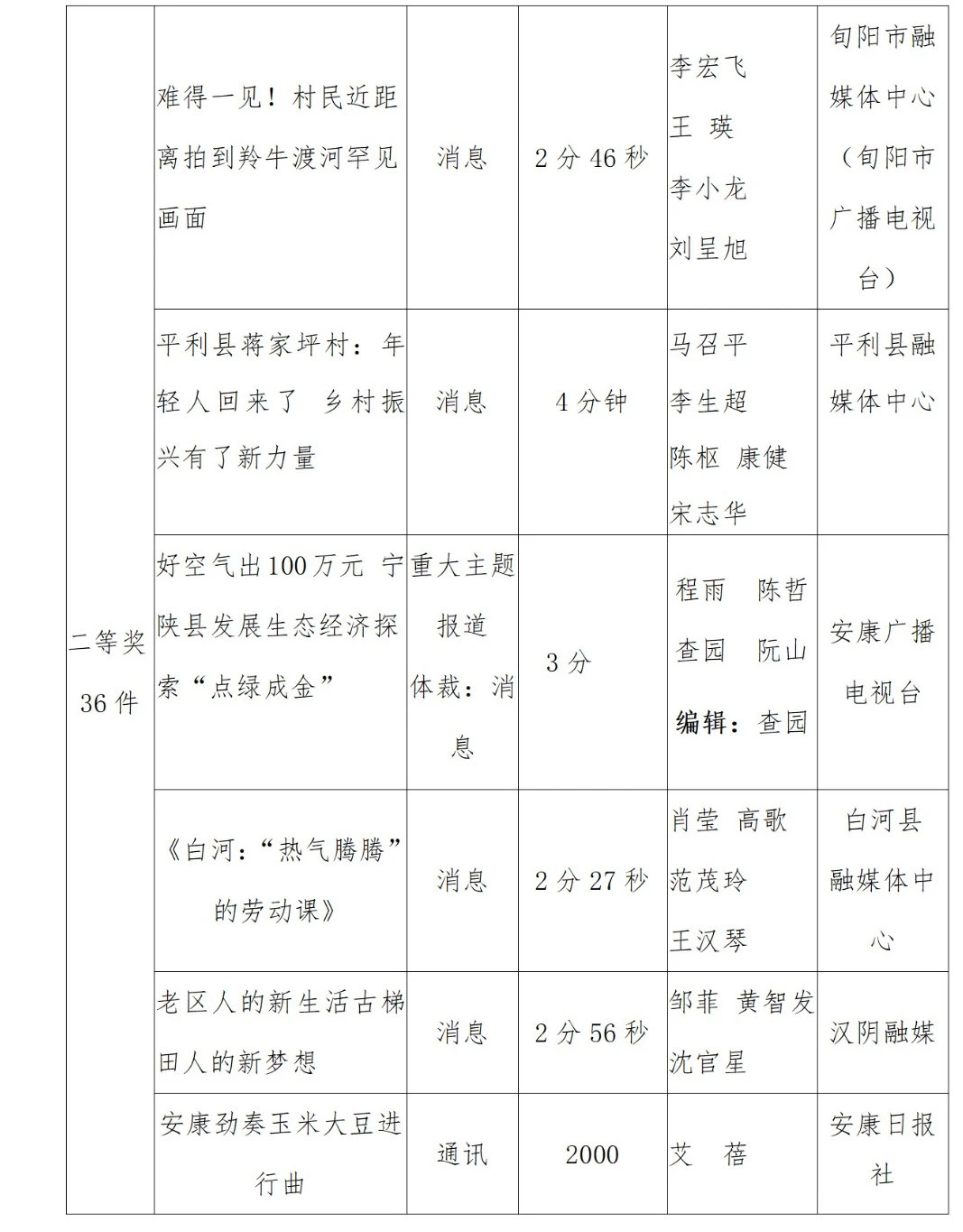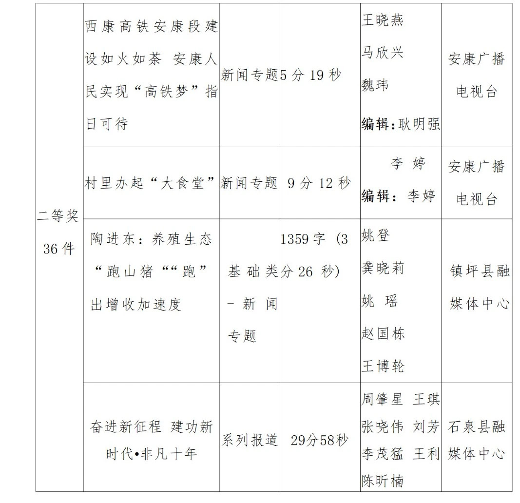 2022年度安康新闻奖评审工作在中共安康市委宣传部的指导下,由市记协具体组织实施,经过各申报单位推荐、初审,市记协复审并组织专家定评,评选出拟获安康新闻奖作品96件,其中一等奖23件、二等奖36件、三等奖37件。拟授予姚登等14名同志“安康市优秀新闻工作者”荣誉称号。5ba安康新闻网