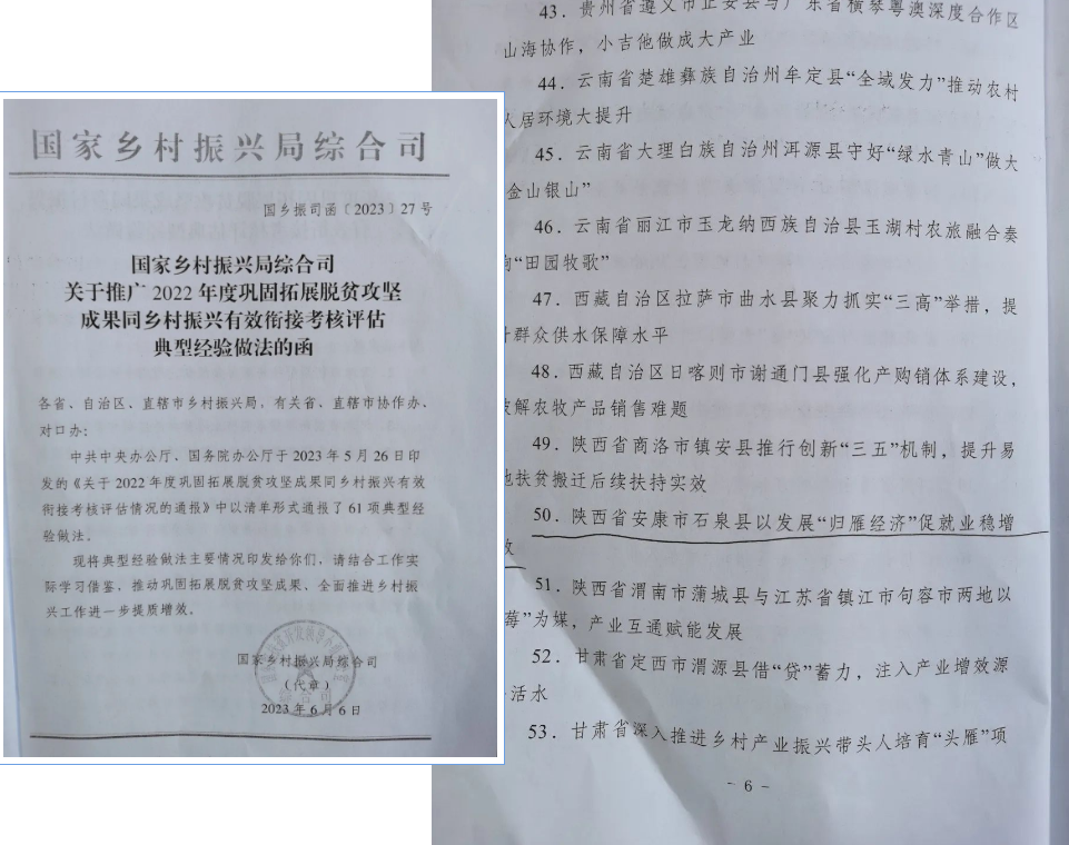 5月26日,由中共中央办公厅、国务院办公厅印发的《关于2022年度巩固拓展脱贫攻坚成果同乡村振兴有效衔接考核评估情况的通报》中,以清单形式通报了61项典型经验做法,其中“安康市石泉县以发展‘归雁经济’促就业稳增收”成功入选。