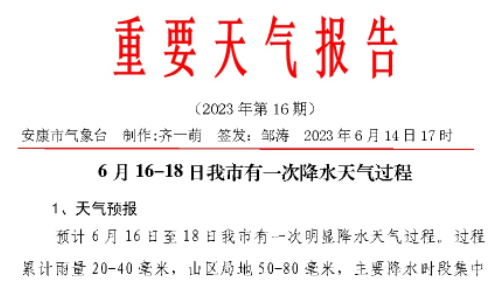 预计6月16日至18日我市有一次明显降水天气过程。过程累计雨量20-40毫米,山区局地50-80毫米,主要降水时段集中在16日夜间到17日夜间,过程期间可能伴有短时强降水,最大小时雨强可达10-25毫米。