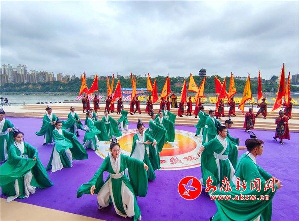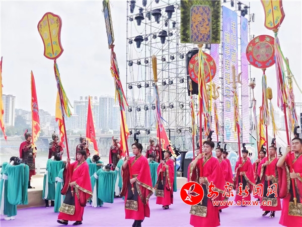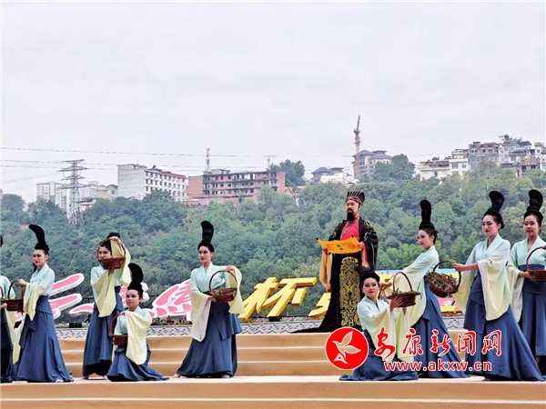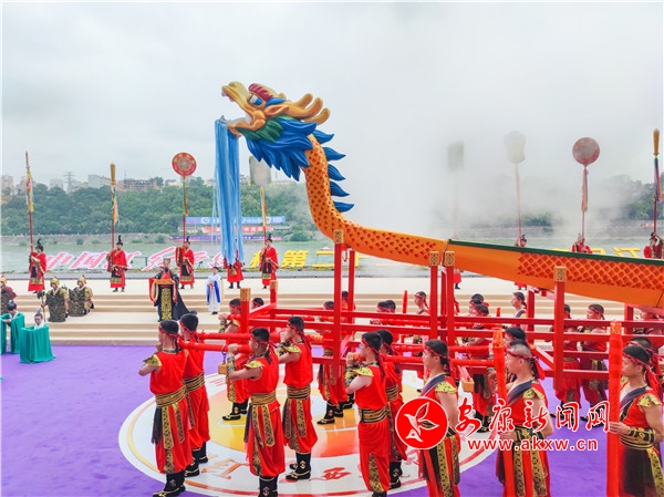 悠悠古琴声中,青衣女子们手提竹篮蹁跹而来。“缅怀先贤”,主祭官一声令下,全场瞩目中,9位大汉护送屈原像至舞台中央,开幕式翻开祭祀篇章。主祭官走向高台仰颈高呼:“咏颂祭文……”百名身着汉服、手持竹简的孩童齐声咏颂,顿挫抑扬,激荡云霄。“万民欢庆歌盛世,安澜裕阜唱安康。”典礼仪成,青衣女子们“兵分两列”,一列把竹篮里面的粽子抛向江中,追念先贤,一列绕场为现场观众赠发香包,送上幸福安康的祝福。