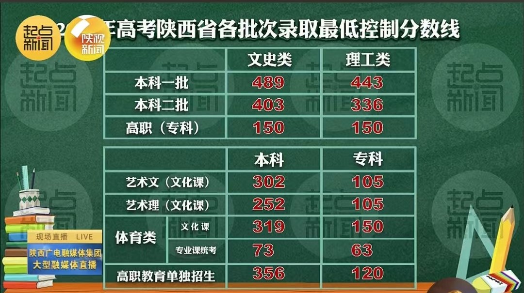 本网讯 6月24日,据2023年陕西省高考各批次录取分数线新闻发布会公布,陕西的文史类分数线,本科一批489分、二批403分、专科(高职)批150分;理工类分数线本科第一批为443分、第二批336分、专科(高职)批150分。