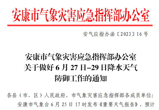 6月25日,安康市气象灾害应急指挥部办公室发布《关于做好6月27日—29日降水天气防御工作的通知》。