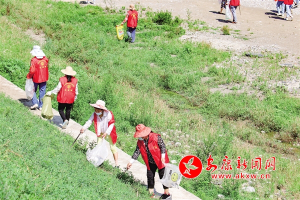 每月1日和15日是旬阳市双河镇高坪社区护河队长朱先萍和姐妹们的户外活动日。一大早她们会套上胶鞋、穿上红马甲拿上火钳、铁铲等工具接二连三地从家中出发再汇聚到当天的活动地点等待队长分配具体任务。