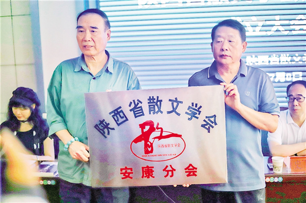 中国散文学会副会长、陕西省散文学会会长陈长吟向省散文学会安康分会会长李焕龙授牌。