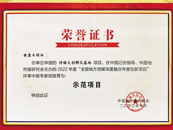 7月9日,全国地市媒体全媒体传播体系建设推进大会在内蒙古乌兰浩特市举行。会上,对第二届全国地方党媒融合发展创新项目进行了表彰,安康日报社的《传媒文创孵化基地》获“示范项目”大奖,此奖项陕西共两家媒体通过评审获奖。