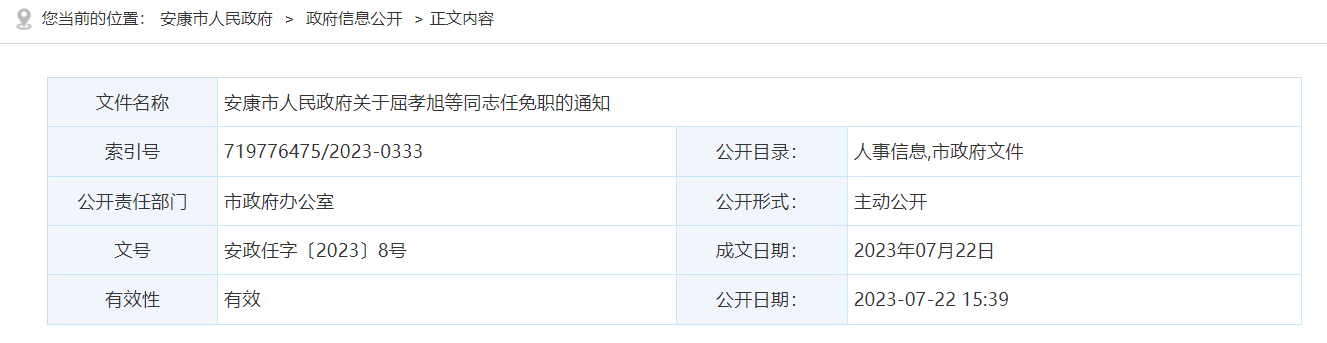 安康市人民政府关于屈孝旭等同志任免职的通知
