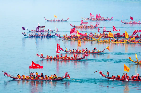 安康龙舟竞渡的场面有多火?从清康熙年间的《石泉县志·风俗》记载里可以感受一下:“鼓乐盈街,红榴绿艾,命索虎符,馈送竟日。官僚尉具席于楼船,敦请长令观龙舟竞渡。男女盈岸……左顾右盼,应接不暇。终日而后骖掉,皆游倦而言旋矣。”