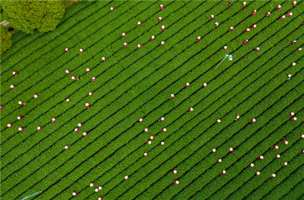 图片2023年5月20日,陕西安康,镇坪县村民在茶园采摘高山富硒茶叶。图/视觉中国
