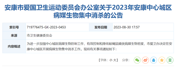 8月30日,安康市爱国卫生运动委员会办公室发布《关于2023年安康中心城区病媒生物集中消杀的公告》,具体如下。
