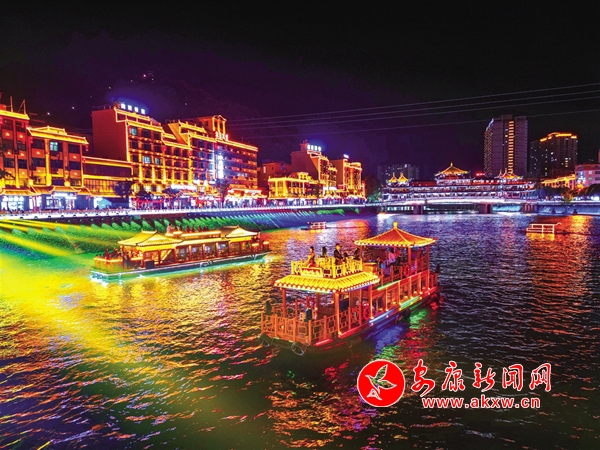 赛场内气氛热烈,激情昂扬;赛场外活动多样,异常精彩。赛事期间,岚皋化身“不夜城”,琉璃灯火,璀璨夜色。每天傍晚,岚皋“硒旺”号画舫乘着晚风从码头缓缓出发,在灯光辉映下流光溢彩,船上轻歌曼舞,为桨声灯影里的岚河平添了一道水上流动风景。岚河两岸纷纷开展各具特色的文旅活动,“岚河夜画”灯光秀把县城装扮得斑斓梦幻,花灯祈福、龙舟竞渡等水上项目供游客参与体验,cosplay、汉服、西游等主题巡游,处处飘荡着欢声笑语,各地游客在欣赏赛事的同时,享受到更多丰富多彩的娱乐生活。拍照、直播、发朋友圈,据不完全统计,赛事及相关活动吸引860余万网民围观。