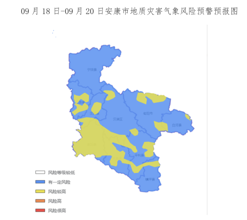经安康市自然资源局、安康市气象局9月18日14时联合会商研判,我市汉滨区、紫阳县、石泉县、镇坪县、岚皋县、平利县、汉阴县、旬阳市、白河县等地的部分地区地质灾害气象风险等级为Ⅲ级(较高风险),其他区域地质灾害气象风险等级为IV级(有一定风险)。请各部门按照各自职责做好地质灾害防治工作。