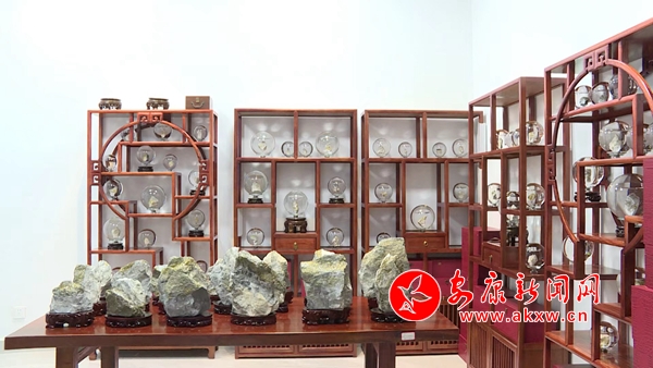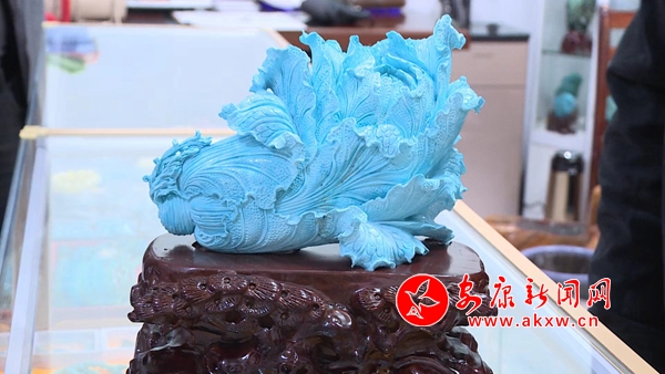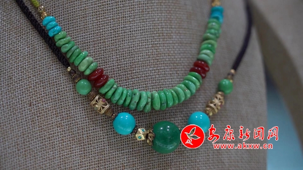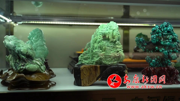 松石展柜中,摆放着各类精致时尚的绿松石饰品,这些通过雕刻家设计打磨后的摆件、项链、手链、耳坠等,都是艺术臻品,它们吸引着人们的目光,让人爱不释手。