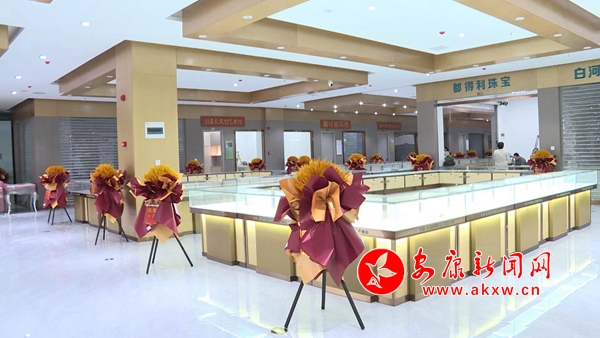 接待大厅的工作人员热情洋溢,商家们正满脸喜气地悬挂牌匾、有的正在摆放各种造型美观的绿松石摆件,还有的则正在和顾客交流甚欢。