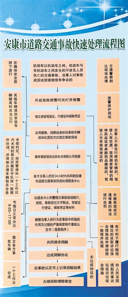 为减少因发生交通事故导致的拥堵,提高交警交通事故处理工作效率,提供快捷的车辆保险理赔维修等相关服务,缓解交通压力,保障市民安全畅通出行。2015年我市成立了道路交通事故快速处理服务中心(以下简称快处中心)受理安康市城市规划区内(包括汉滨区、高新区、瀛湖风景区)发生的轻微交通事故。