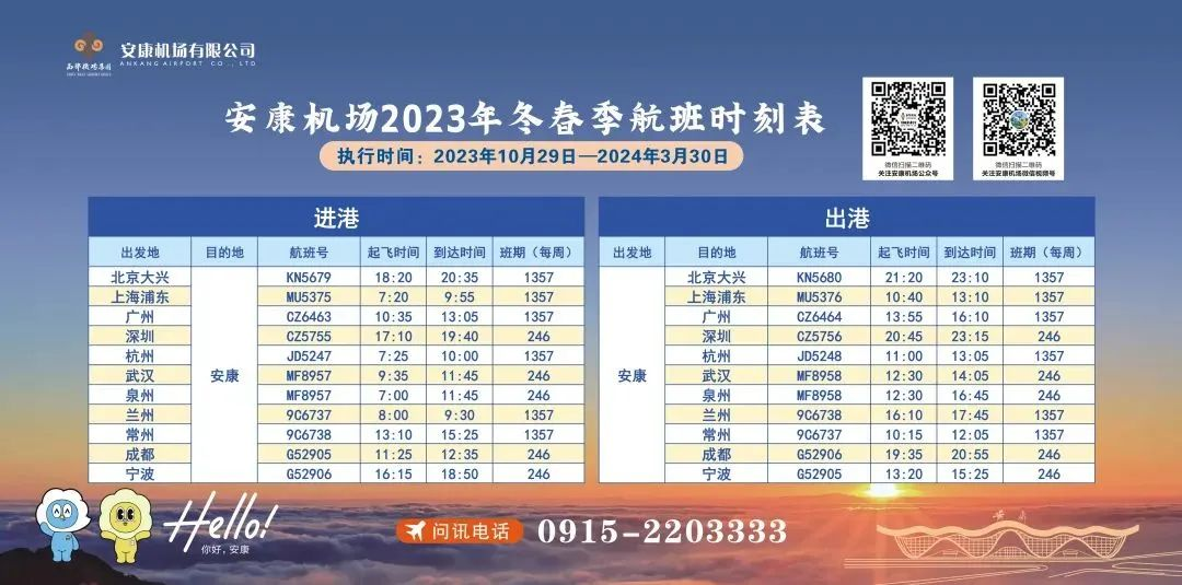 2023年10月29日至2024年3月30日,安康机场将正式执行冬春季航班计划。航班计划共8条航线,通航国内11座城市,分别为: