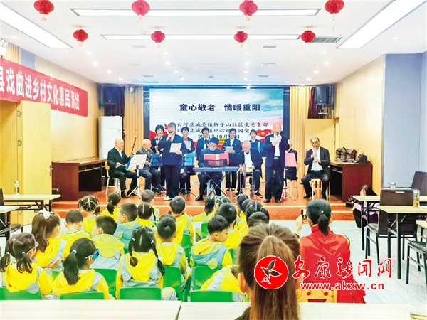 白河县狮子山社区联合城关镇中心幼儿园举办“童心敬老情暖重阳”主题活动。黄秀琴 摄