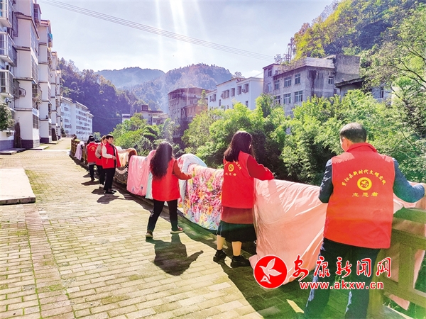 紫阳县高桥镇桂花树社区组织新时代文明实践志愿者服务队,帮助社区行动不便的独居老人、残疾人晒被子、装过冬棉被。胡波 王顺勤 摄