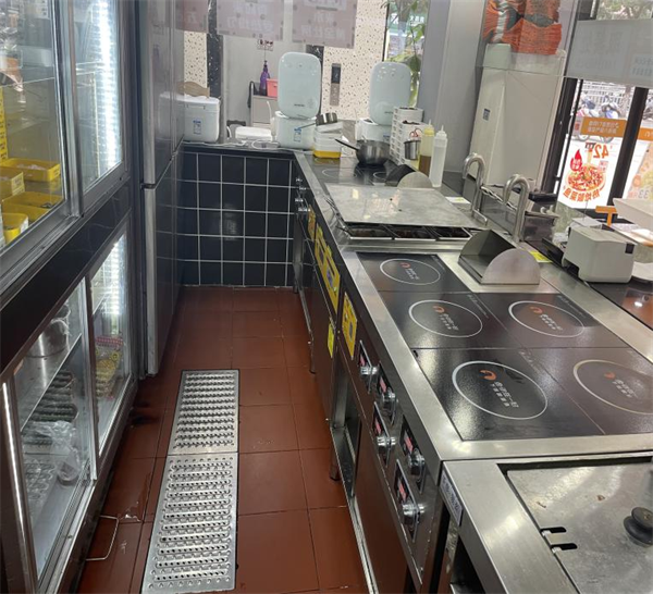 店内环境脏乱,后厨卫生差,无“三防”设施。