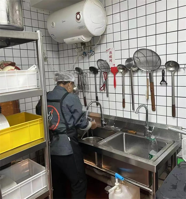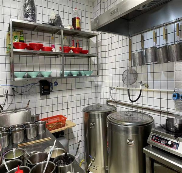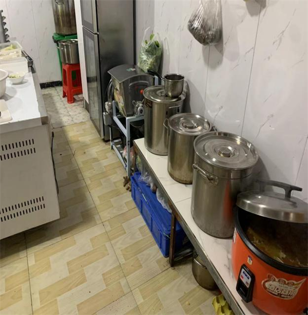 后厨脏乱差,物品随意摆放,卫生清理不及时。