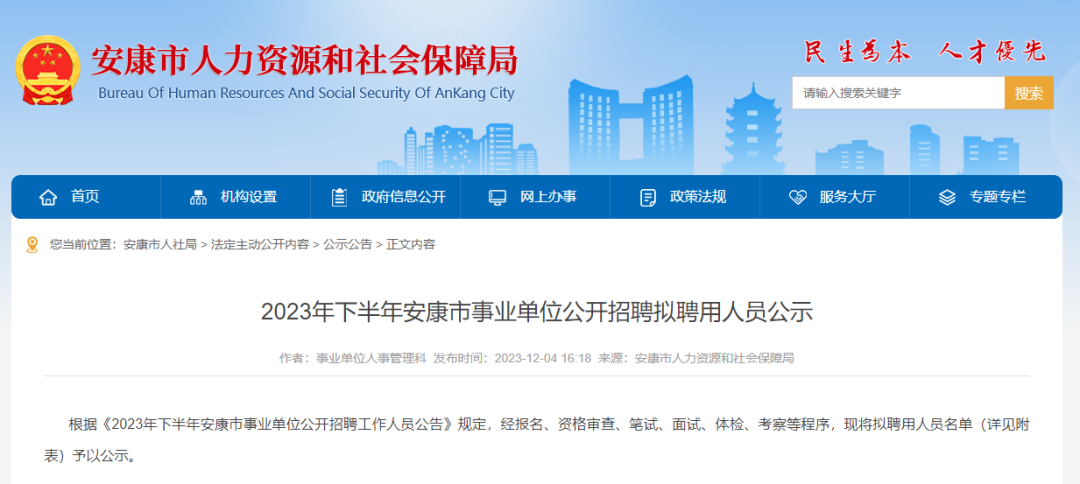 12月4日,安康市人力资源和社会保障局发布2023年下半年安康市事业单位公开招聘拟聘用人员公示。z4K安康新闻网