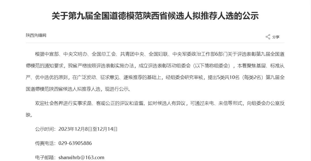 根据中宣部、中央文明办、全国总工会、共青团中央、全国妇联、中央军委政治工作部6部门关于评选表彰第九届全国道德模范的通知要求,我省严格按照评选表彰实施办法,成立评选表彰活动组委会(以下简称组委会),本着聚焦基层、标准从严、优中选优的原则,在广泛发动、征求意见、逐级推荐的基础上,经组委会研究审核,提出5类共10名(每类2名)第九届全国道德模范陕西省候选人拟推荐人选,现进行公示。