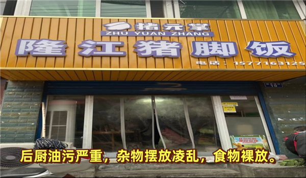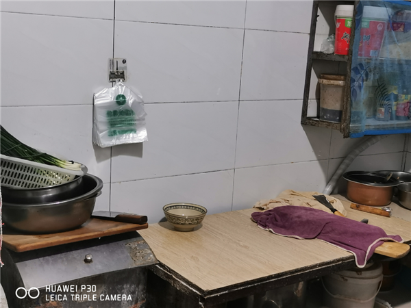 后厨油污严重,杂物摆放凌乱,食物裸放。