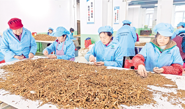 村民们处理挖掘出来的野生葛根,这批野生葛根即将交售给阳弘润本草中药材发展有限公司