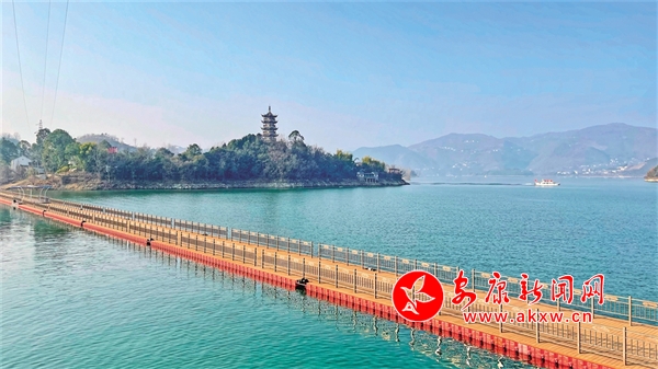 △ 瀛湖新建浮桥,全长256米、宽6米,连接金螺岛与唐家链子