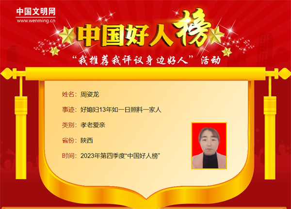 周姿龙,女,1969年8月生,陕西省安康市汉滨区晏坝镇泰山庙村村民。丈夫车祸摔跤致瘫在家后,周姿龙坚强地挑起了生活的重担。13年来,她护理身体瘫痪的丈夫、照顾精神障碍的姑姐、照料年事已高的公公,用自己的坚定和责任,为家人撑起了一片爱的天空。