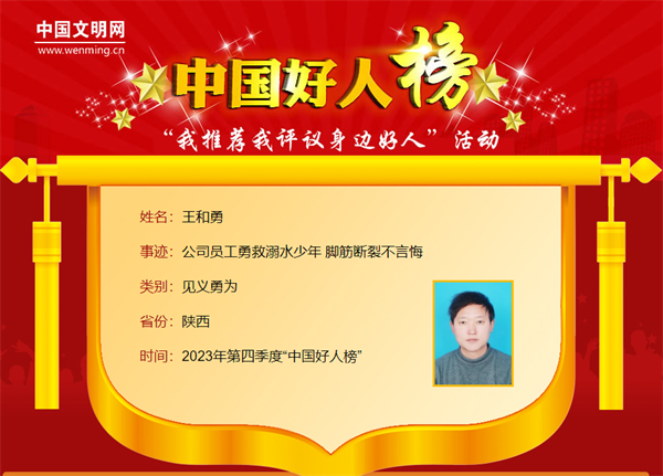 王和勇,男,1987年8月生,陕西省水务公司职工。在少年溺水的危机时刻,王和勇忘记自己“准爸爸”的身份,毫不犹豫跳进水流湍急的河里奋勇施救。王和勇曾获“陕西好人”荣誉。
