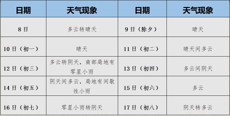 本网讯 2月7日10时,市气象台发布《春节天气预报》:春节前期(除夕到初二)我市以晴天到多云天气为主,气温回升明显,预计全市最高气温升至15℃以上,东部县区可能接近20℃;初三,阴天,南部局地零星小雨;初四,多云间阴天;初五阴天有间歇性小雨;初六多云;初七零星小雨转阴天;初八阴天转多云。 MZM安康新闻网