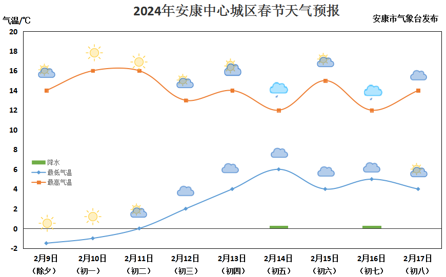 春节期间冷空气对我市影响较小,最高气温起伏不大,预计川道地区 11~18℃,秦巴山区:8~14℃,最低气温初三以前相对较低,后期有所升高:川道地区 -2~5℃,秦巴山区:-5~1℃。MZM安康新闻网