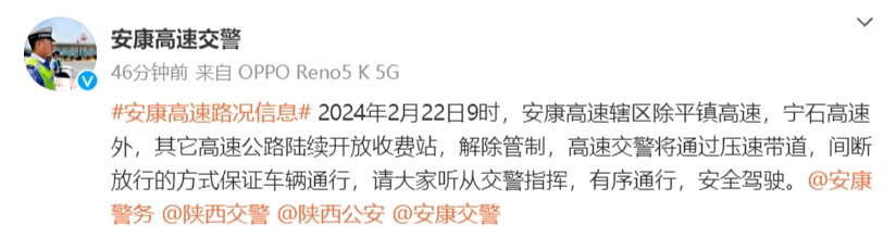 2月22日9时,安康高速交警发布通知:安康高速辖区除平镇高速,宁石高速外,其它高速公路陆续开放收费站,解除管制,高速交警将通过压速带道,间断放行的方式保证车辆通行。LPW安康新闻网