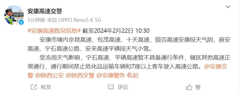 据安康高速交警消息:截至2024年2月22日10:30,安康市境内京昆高速、包茂高速、十天高速、银百高速安康段天气阴、麻安高速、宁石高速公路、安来高速平镇段天气小雪。受冻雨天气影响,宁石高速、平镇高速暂不具备通行条件,辖区其他高速正常通行,通行期间禁止危化品运输车辆和7座以上客车驶入高速公路。ELM安康新闻网