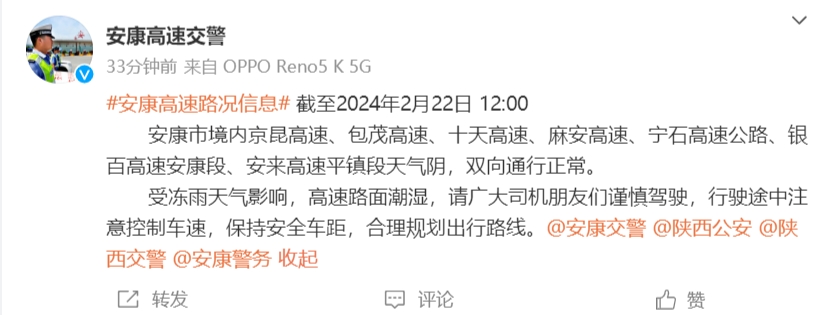 据安康高速交警消息:截至2024年2月22日12:00,安康市境内京昆高速、包茂高速、十天高速、麻安高速、宁石高速公路、银百高速安康段、安来高速平镇段天气阴,双向通行正常。受冻雨天气影响,高速路面潮湿,请广大司机朋友们谨慎驾驶,行驶途中注意控制车速,保持安全车距,合理规划出行路线。 hKJ安康新闻网