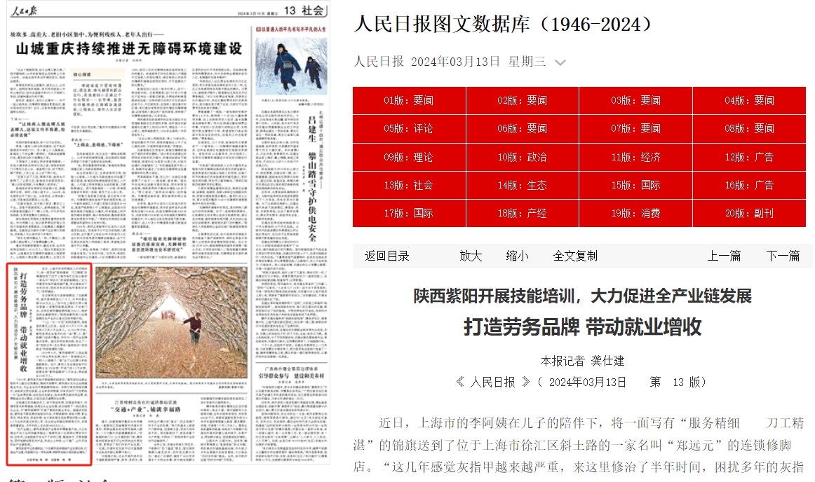 2019年6月,“紫阳修脚师”入选全国20个知名劳务品牌,成为一张地域名片。一把小小修脚刀,“修”出了山区群众的致富新路径。迄今,紫阳人在全国各地开办修脚企业130余家,开设门店1.5万余家,培育在岗“紫阳修脚师”5万余名,带动就业20余万人。