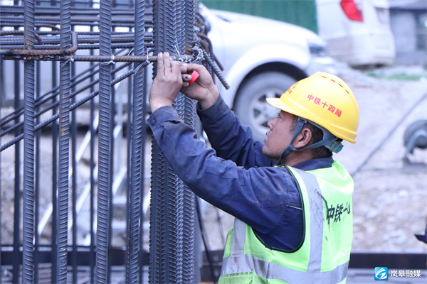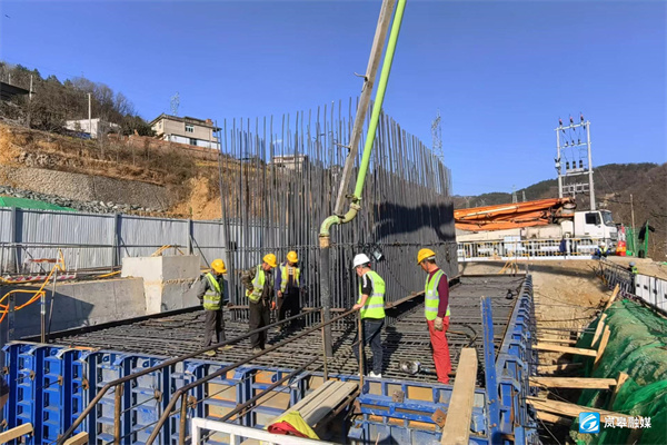 “对施工现场承台尺寸测量和检查,确保承台的尺寸和位置准确无误。随后按照设计图纸及规范要求绑扎承台钢筋,布设降温管,埋设墩身预埋钢筋,定型钢模板安装加固,以确保承台的强度和稳定性。”现场技术员高敬智说道。施工中,参建单位严格落实安全质量技术交底,优化施工配置,项目技术人员全程盯控,按标准化施工要求分层浇筑、振捣、下料,确保混凝土浇筑顺利进行。