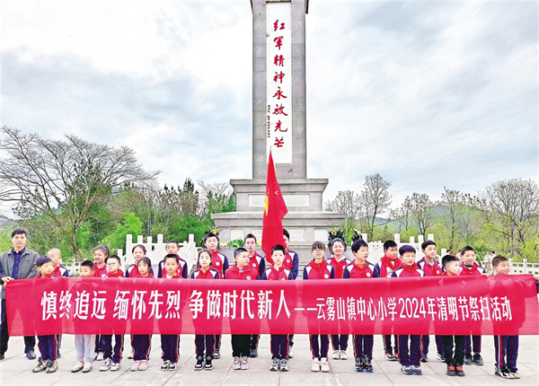 ▲ 4月1日,在清明节即将到来之际,石泉县云雾山镇中心小学组织部分少先队员,在红军英雄纪念碑前开展爱国主义教育。谭相华 摄