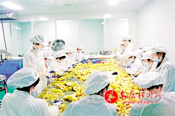 中厂镇石梯社区木瓜产业园区里工人们为木瓜去皮。王茜 摄