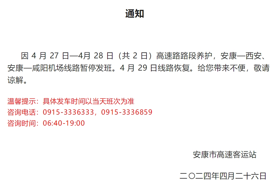 本周末 安康至西安、咸阳机场高速客运暂停发班